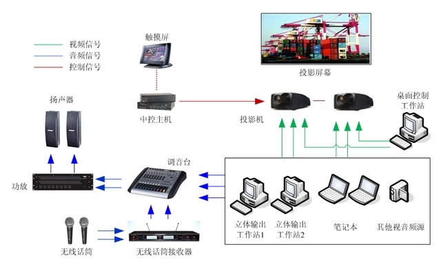 整个实验室采用以BARCO Galaxy NW-12立体仿真专用投影机为核心的2通道CADWALL投影显示系统,配备计算机系统、音响及中控系统、相关仿真软件等。该投影系统配合图像生成、音频处理、中央控制统、视景软件开发平台等,形成一个可以兼顾二维和三维应用的虚拟现实平台(如图1)。